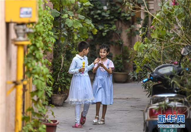 在新疆喀什古城景區(qū)內(nèi),當?shù)貎擅∨笥炎咴谙锏纼?nèi)(8月12日攝)。新華社記者 王菲 攝