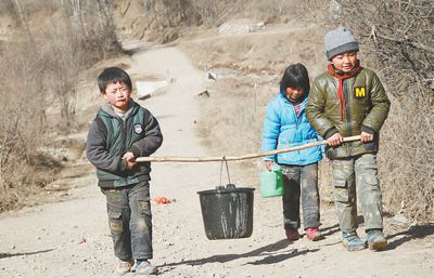 脫貧前,渭源縣元古堆村的孩子們從取水點(diǎn)抬水。攝于2013年3月。新華社記者 范培珅攝