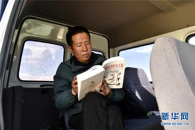 9月25日,青海湖國家級自然保護區(qū)管理局的巡湖觀測人員王延明在巡湖間隙閱讀中國鳥類野外手冊。