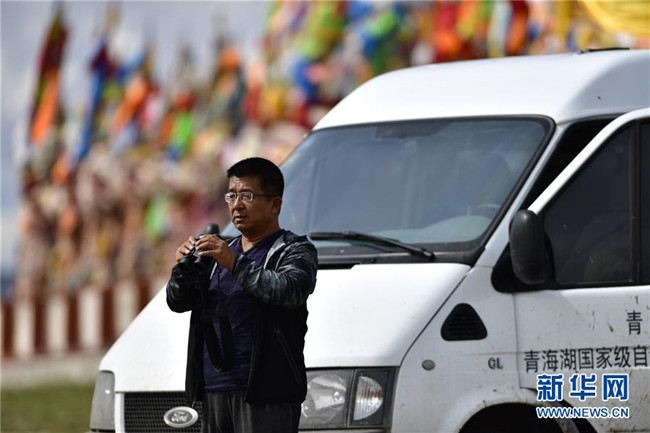 9月24日,青海湖國家級自然保護區(qū)管理局的巡湖觀測人員王延明在青海湖畔進行觀測。