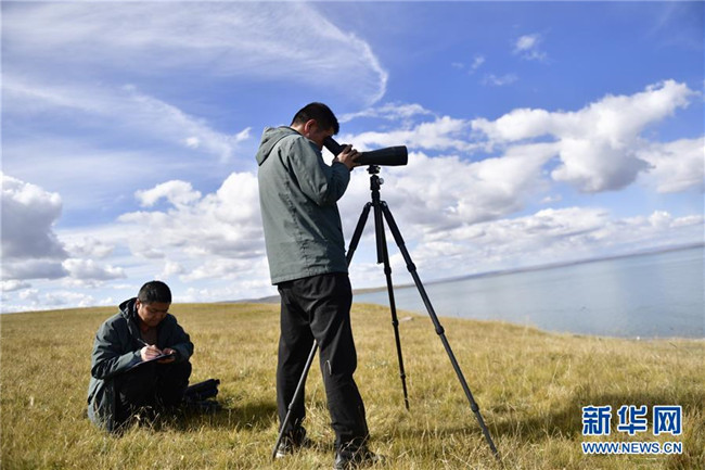 9月23日,青海湖國家級自然保護區(qū)管理局的巡湖觀測人員在青海湖畔進行觀測。