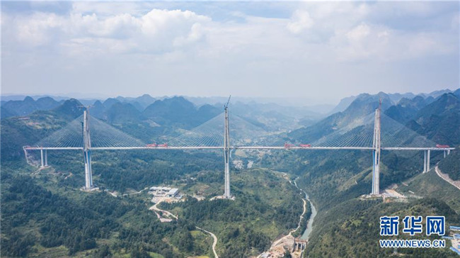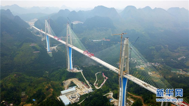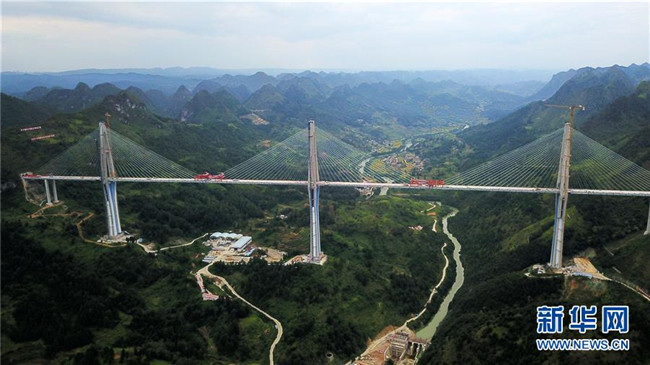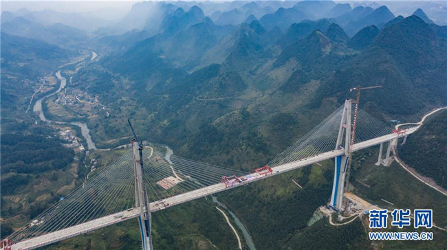 當日,332米高的全球最高混凝土橋塔——貴州平塘至羅甸高速公路控制性工程平塘特大橋成功合龍。記者從貴州省交通運輸廳了解到,平塘特大橋全長2135米,橋面寬30.2米,規(guī)劃雙向4車道,是一座三塔雙索面疊合梁斜拉橋。三座橋塔的高度分別為320米、332米和298米,相當于在峽谷之中建了三座100多層高的大樓。平塘特大橋于2016年4月開工建設(shè),2018年11月橋塔順利封頂,計劃總工期為42個月,總投資15億元。此次合龍后,還要進行橋面施工和欄桿等工程建設(shè),預計今年底全橋通車,屆時平塘到羅甸的通行時間將從2個半小時縮短至1小時,將成為連接貴州南部的交通要道,對助推滇黔桂石漠化片區(qū)脫貧攻堅具有重要意義。新華社記者楊文斌攝