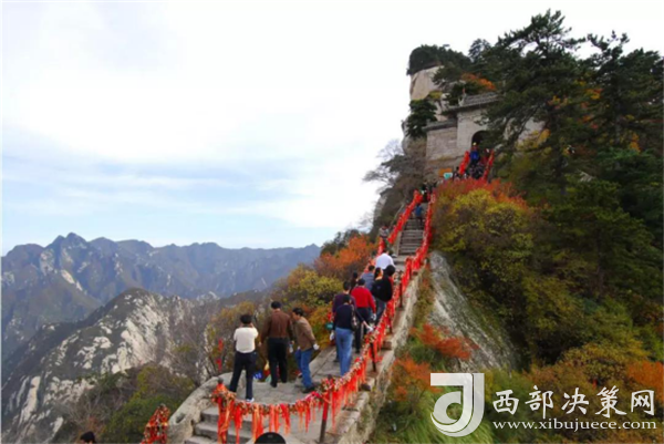 華山的紅葉代表著一種頑強不息的精神。深秋時節(jié),相比其它之地的紅葉已經(jīng)遠(yuǎn)去,華山的紅葉依然昂首挺立、紅艷光彩依然不減??v觀它的一生風(fēng)雨凄凄路,幾度浮浮沉沉,九月發(fā)出璀璨奪目的金黃,就在我們還在為它鮮艷無比的外衣感嘆時,十月又搖身一變?yōu)樯罴t色,火紅色,為了滿足游客挑剔的眼光,不惜消耗他短暫的在世時光,而誰又能看到他嘔心瀝血、默默奉獻(xiàn)、痛苦掙扎而感動呢?想必它的每一次完成生命蛻變都是歷經(jīng)鳳凰涅槃的洗禮。