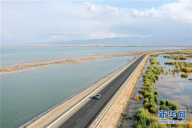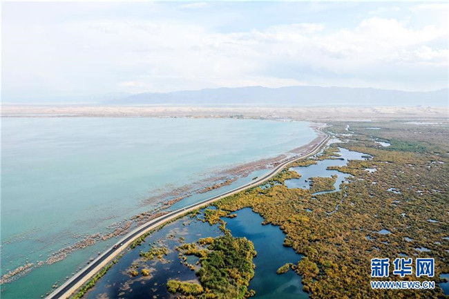 這是新疆博斯騰湖河堤公路(10月12日無(wú)人機(jī)拍攝)。入秋以來(lái),新疆博斯騰湖碧波蕩漾,美景如畫,吸引各地游客前來(lái)游玩。新華社記者丁磊攝