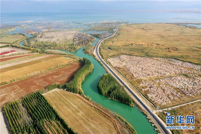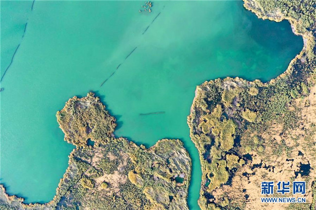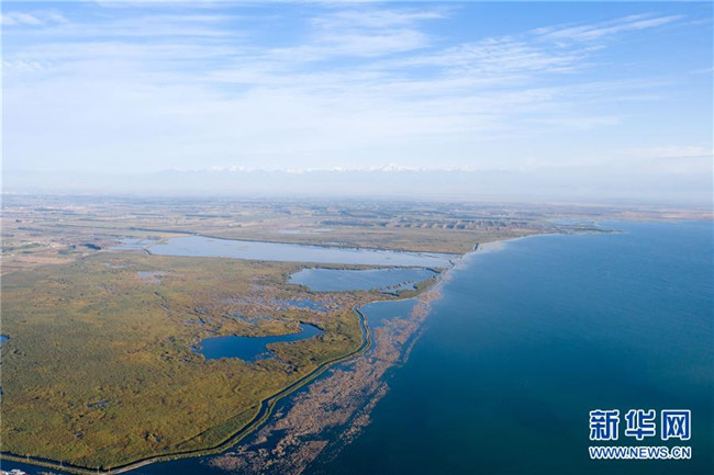 開都河支流匯入博斯騰湖(10月12日無(wú)人機(jī)拍攝)。入秋以來(lái),新疆博斯騰湖碧波蕩漾,美景如畫,吸引各地游客前來(lái)游玩。新華社記者丁磊攝