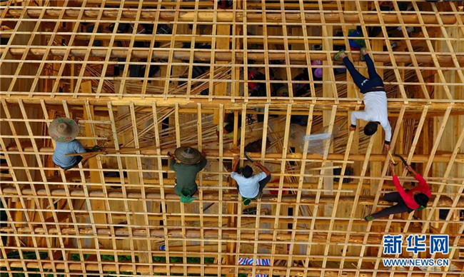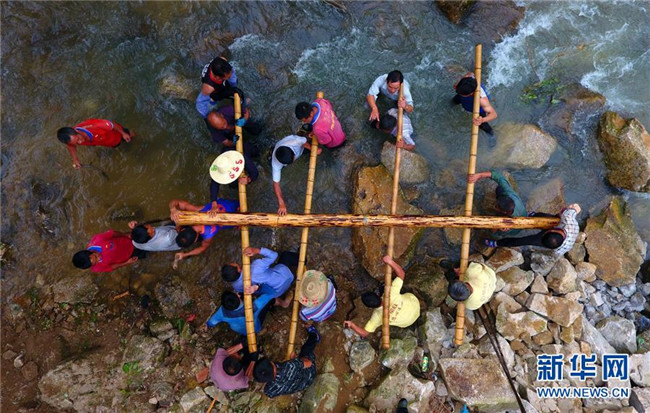 在黔桂烏英苗寨,群眾在幫助貧困戶吳仕足修建新木樓(9月3日無(wú)人機(jī)拍攝)。