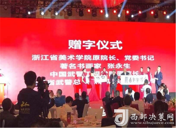 浙江省美術(shù)學(xué)院原院長(zhǎng)、黨委書記、著名書畫家——張永生,浙江省武警總隊(duì)原總隊(duì)長(zhǎng)何虎少將現(xiàn)場(chǎng)贈(zèng)字,西鳳股份公司副董事長(zhǎng)、總經(jīng)理賈智勇上臺(tái)接受贈(zèng)字。