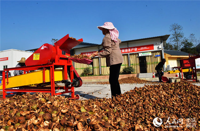 近日,重慶酉陽(yáng)萬(wàn)畝油茶喜獲豐收,工人們正忙著晾曬油茶籽。陳碧生攝近日,重慶酉陽(yáng)萬(wàn)畝油茶喜獲豐收,工人們正忙著晾曬油茶籽。陳碧生攝