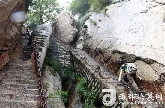 從群仙觀上行,便是“老君犁溝”。傳說,這里原來沒有路,是老子李耳駕青牛用鐵犁開的,形如耕地時留下的犁溝,故被稱為“老君犁溝”。“老君犁溝”同千尺幢、百尺峽一樣,是登華山的必經險道之一?,F(xiàn)在,已在犁溝的右上方,鑿成271個石級,兩旁鐵鏈下垂,行走較為安全。