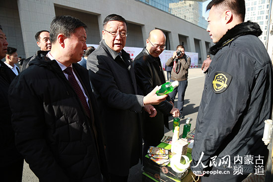 內蒙古市場監(jiān)督管理局局長白清元查看現場展示的假冒偽劣商品。