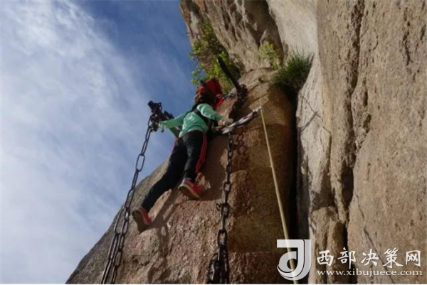 長空棧道:“長空棧道”可謂華山險道之首,它尤如一道奇異的仙練鑲嵌在南峰絕壁。明代“后七子”之一的李攀龍《太華山記》載:“出南天門向西就是棧道,棧雖有銅柱鐵索攔護,然闊不盈尺。行二十余丈方至盡頭。下折為井,高約三丈,旁出復為棧……”置身其中,直覺背空腳虛,發(fā)豎氣閉,寒風沖襠,骨松筋緊,膽大者有凌空欲飛之感,膽弱者心生抵近鬼門之憂。多少年來“長空棧道”以它特有的絕險情懷召喚著天下英雄豪杰一試身手,體驗驚心動魄,揮灑豪邁人生。