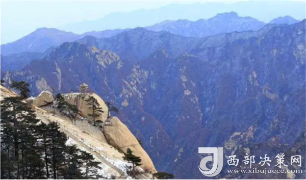8、從玉泉院出發(fā),經(jīng)“回心石”、“千尺幢”、”百尺峽”和“老君犁溝”到北峰,從北峰南上,經(jīng)“擦耳崖”、“蒼龍嶺”,過金鎖關,從這里可分別前往東、中、南、西三峰。