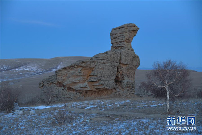 這是11月25日拍攝的克什克騰石陣景區(qū),這塊石頭名為“鯤鵬落草原”。