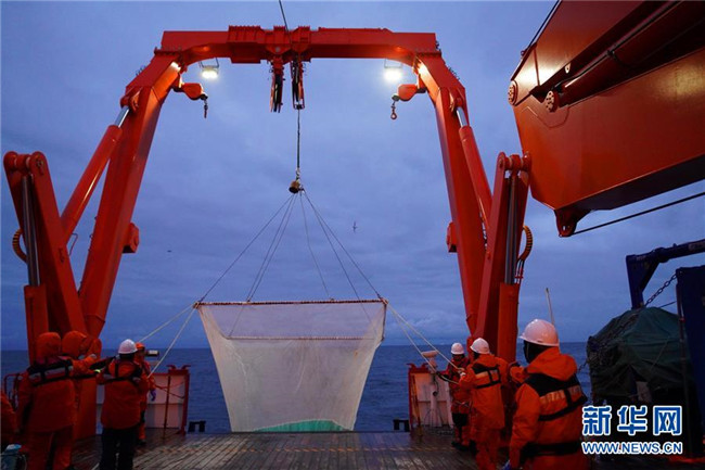 “雪龍2”號12月7日離開南大洋普里茲灣海域向西航行,開始對宇航員海海域展開科考作業(yè)??瓶缄?duì)員沿著本次宇航員海科考的首個(gè)調(diào)查斷面,自北向南做了多個(gè)站位的CTD(海水溫鹽深測量儀)采水作業(yè)、浮游生物垂直拖網(wǎng)作業(yè),以及魚類拖網(wǎng)和箱式采樣器等采樣作業(yè)。