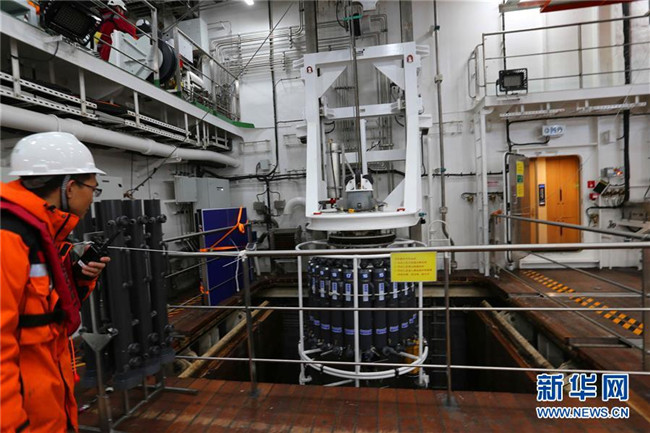 12月9日,科考隊(duì)員首次利用“雪龍2”號月池系統(tǒng)進(jìn)行CTD采水作業(yè)。 新華社記者 劉詩平 攝