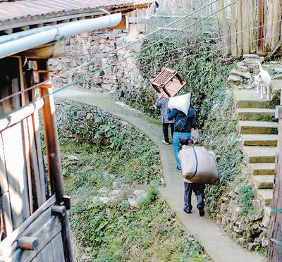 楊昌儒(右)與妻子姜建元(中)、兒子楊海林將行李搬上車,準(zhǔn)備前往縣城安置點。