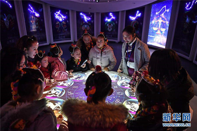 12月14日,拉薩市實驗小學學生在藏域星球天文科普體驗館學習星座知識。當日,藏域星球天文科普體驗館在西藏拉薩開館試運營,這是西藏第一家天文科普體驗館。據(jù)介紹,此館以感知宇宙、認知宇宙、探索宇宙為主題,以參觀者的第一感官體驗為設(shè)計導向,利用互動投影、懸浮投影、物體跟蹤、人體捕捉、體感互動、VR等高科技手段展示藏地的神秘,揭示宇宙的奧秘。新華社記者李鑫攝