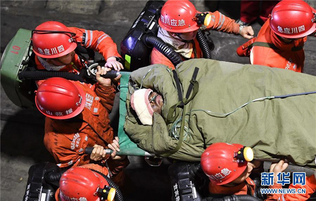 12月18日,救援人員轉(zhuǎn)運安全升井的被困人員。 當(dāng)日7時56分,經(jīng)過80多個小時的緊張救援,發(fā)生透水事故的川煤集團(tuán)杉木樹煤礦13名被困人員全部安全升井。 新華社記者 薛玉斌 攝