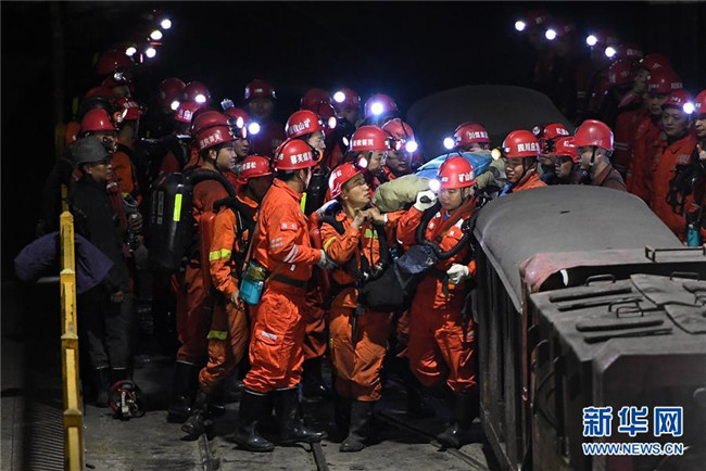 12月18日,救援人員轉(zhuǎn)運安全升井的被困人員。新華社記者 薛玉斌 攝