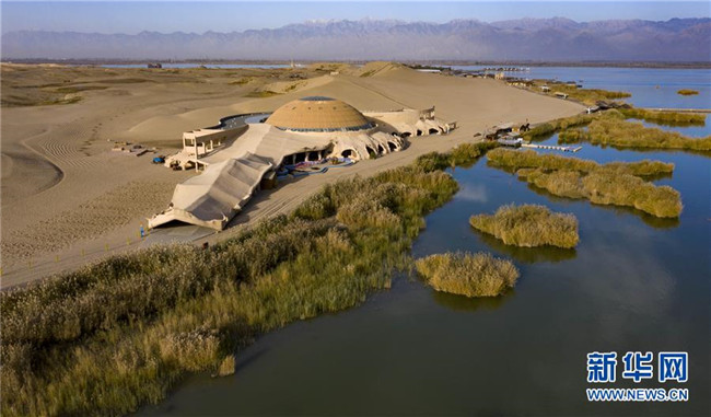 位于寧夏石嘴山市平羅縣境內(nèi)的沙湖景區(qū),依沙傍水呈現(xiàn)出獨(dú)特的魅力(10月30日無(wú)人機(jī)拍攝)。 新華社記者 馮開(kāi)華 攝