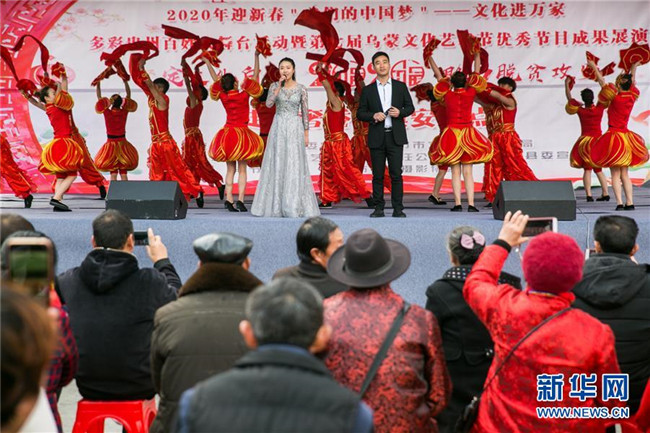 1月6日,在貴州省畢節(jié)市大方縣奢香古鎮(zhèn),志愿者為村民表演節(jié)目。新華社發(fā)(羅大富 攝)