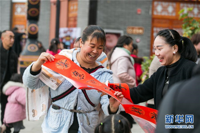 1月6日,在貴州省畢節(jié)市大方縣奢香古鎮(zhèn),村民在晾曬剛寫好的春聯(lián)。新華社發(fā)(羅大富 攝)