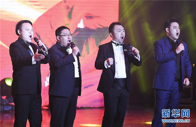 1月12日,中央歌劇院文藝小分隊志愿者在慰問演出上表演男聲四重唱。新華社記者 王全超 攝