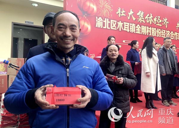 張國(guó)明代表金剛村16社領(lǐng)取了股東分紅。胡虹 攝