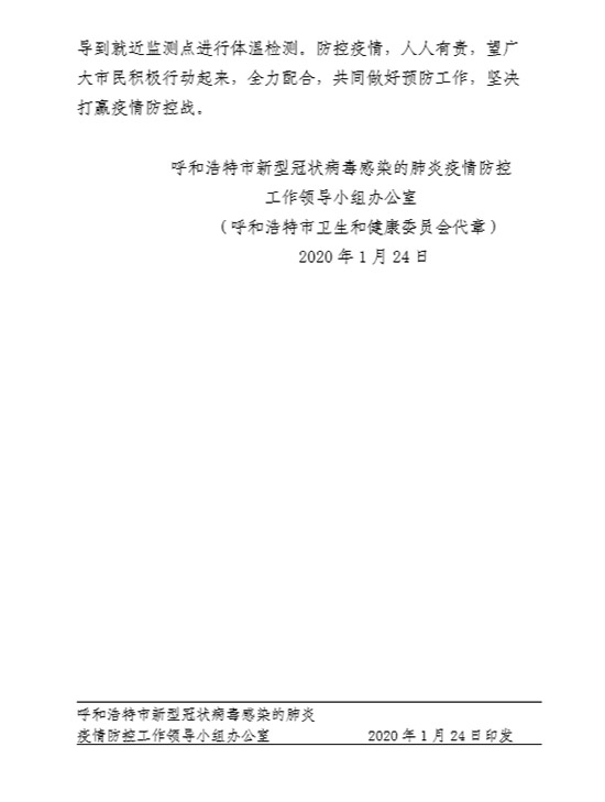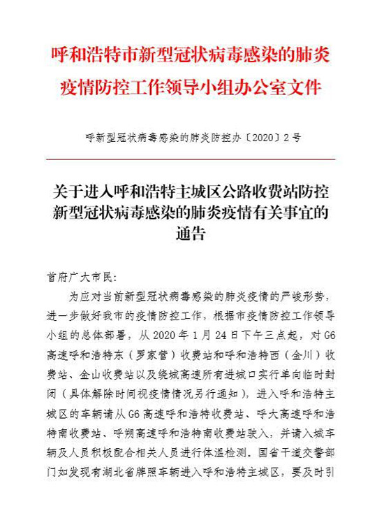 記者從呼和浩特市新型冠狀病毒感染的肺炎疫情防控工作領(lǐng)導(dǎo)小組辦公室獲悉,為應(yīng)對當(dāng)前新型冠狀病毒感染的肺炎疫情的嚴(yán)峻形勢,進(jìn)一步做好呼和浩特市的疫情防控工作。從2020年1月24日下午三點(diǎn)起,對G6高速呼和浩特東(羅家營)收費(fèi)站和呼和浩特西(金川)收費(fèi)站、金山收費(fèi)站以及繞城高速所有進(jìn)城口實(shí)行單向臨時(shí)封閉(具體解除時(shí)間視疫情情況另行通知)。進(jìn)入呼和浩特主城區(qū)的車輛請從G6高速呼和浩特收費(fèi)站、呼大高速呼和浩特南收費(fèi)站、呼朔高速呼和浩特南收費(fèi)站駛?cè)?,并請入城車輛及人員積極配合相關(guān)人員進(jìn)行體溫檢測。