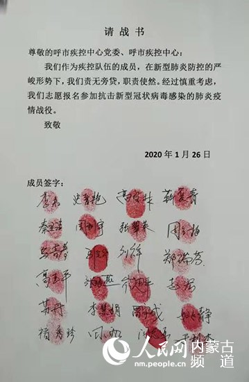 1月26日,1000封按滿紅手印的請戰(zhàn)書“刷屏”了。“在全國上下齊心協(xié)力共同抗擊新型冠狀病毒感染的肺炎疫情之際,請各位主任統(tǒng)計(jì)匯總本科室主動申請隨時(shí)去抗疫前線的醫(yī)師,并將自愿報(bào)名的名單發(fā)至本群。”呼和浩特市第一醫(yī)院普外科主任醫(yī)師烏云塔娜把“請戰(zhàn)”信息發(fā)到微信群后,手機(jī)就一直響個(gè)不停。不到一天,呼和浩特市第一醫(yī)院主動“請戰(zhàn)”的醫(yī)護(hù)人員就達(dá)到200多人。