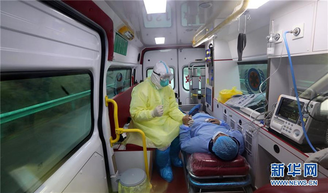駐守在咸寧中心醫(yī)院的云南醫(yī)療隊(duì)醫(yī)療二組組長李波趕赴嘉魚縣人民醫(yī)院,轉(zhuǎn)運(yùn)一名新冠肺炎臨床診斷病例(2月21日攝)。新華社發(fā)(楊崢 攝)