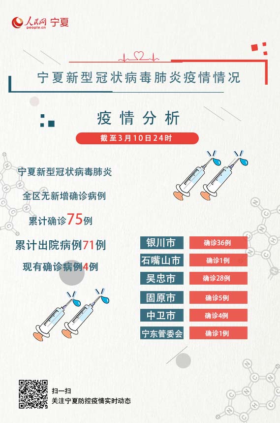 截至3月10日24時(shí),全區(qū)現(xiàn)有確診病例4例,累計(jì)出院病例71例。全區(qū)累計(jì)報(bào)告確診病例75例,其中銀川市36例,石嘴山市1例,吳忠市28例,固原市5例,中衛(wèi)市4例,寧東1例。全區(qū)無(wú)疑似病例。