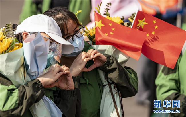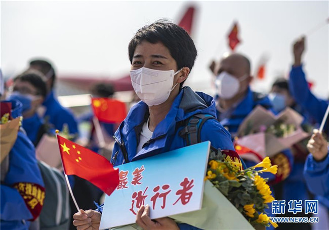 3月22日,云南省援鄂醫(yī)療隊(duì)隊(duì)員在昆明長(zhǎng)水機(jī)場(chǎng)參加歡迎儀式。新華社記者 江文耀 攝