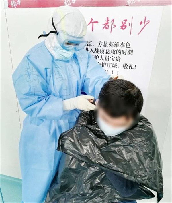 1艙有康復(fù)人員想理發(fā),手頭沒有工具,朱晴護(hù)士長得知后,聯(lián)系下個(gè)班次護(hù)士帶來推子,給大家理發(fā)。“看你動作很嫻熟啊,以前練過的吧”,“圍觀群眾”打趣道。“現(xiàn)學(xué)現(xiàn)賣,大家要求不要太高,有壓力啊!”朱晴說。一直推到推子沒電,朱晴給6位康復(fù)人員簡單修剪了頭發(fā)。得知朱晴是西安醫(yī)療隊(duì)的護(hù)士,大家都親切的稱她“肉夾饃”!