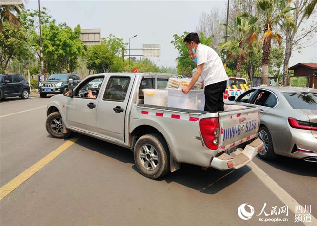 3月31日中午,西昌一外賣小哥隊伍免費為撲火隊伍送餐。據(jù)悉,目前西昌市已有11家餐飲企業(yè)參加義務(wù)送餐。(記者宋豪新 王波)