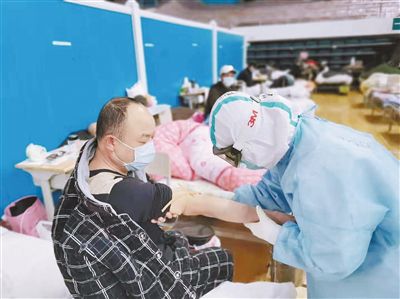 對于護理醫(yī)療隊的隊員們來說,在洪山體育館武昌方艙醫(yī)院的每一天,都是那么緊張。護理人員需快速對新入院的患者實施入院流程管理,觀察病情、監(jiān)測病人生命體征,及時將不適合入院的患者分診出轉(zhuǎn)至定點醫(yī)院;在為患者做好血氧監(jiān)測、體溫監(jiān)測等??谱o理的同時,還包攬了喂飯、喂藥、翻身、擦洗、換衣、大小便管理等各種貼身護理工作。這些看起來簡單的工作,卻因為要在防護服、口罩、護目鏡等防護裝備的層層包裹下進行,變得異常吃力。最忙的時候,3個護士要同時護理82名患者,但隊員們憑著自身過硬的護理經(jīng)驗,攻克了一個又一個難關。