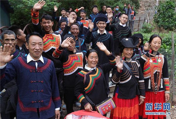 5月12日,四川省昭覺縣阿土列爾村第一批26戶貧困戶坐上開往昭覺縣易地扶貧搬遷縣城集中安置點的新家,與其他村民道別。新華社記者江宏景攝