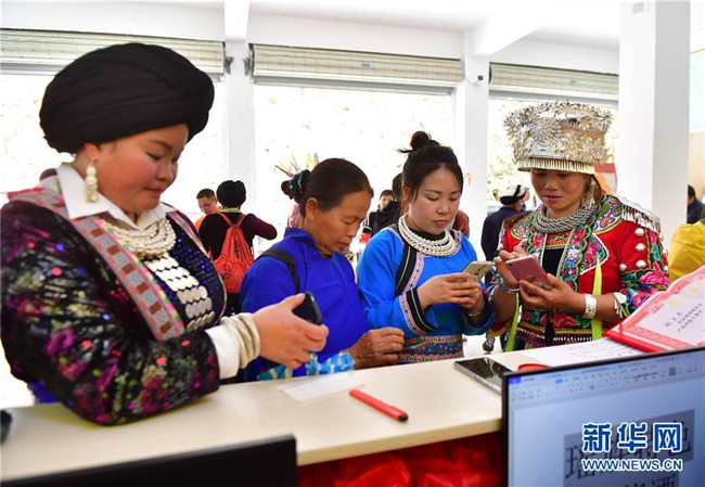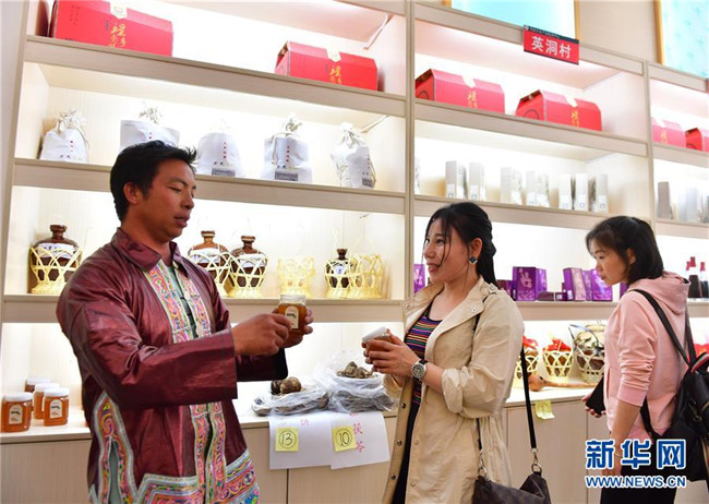 5月12日,在廣西融水苗族自治縣同練瑤族鄉(xiāng)民族廣場,少數(shù)民族群眾在展示特色產(chǎn)品。新華社記者 黃孝邦 攝