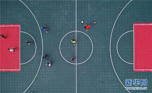 在廣西融水苗族自治縣桿洞鄉(xiāng)黨鳩小學(xué),學(xué)生們在新球場上踢球(5月13日攝,無人機照片)。新華社記者黃孝邦攝
