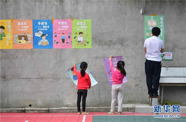 在廣西融水苗族自治縣桿洞鄉(xiāng)黨鳩小學(xué),師生們在校園里張貼海報(5月13日攝)。新華社記者黃孝邦攝