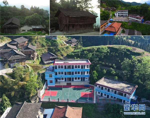 這張拼版照片的上圖左、中為黨鳩小學(xué)2006年之前一直使用的木質(zhì)教學(xué)樓(資料照片);上圖右為黨鳩小學(xué)自2006年至改造前的教學(xué)樓(新華社記者黃孝邦2019年7月5日攝,無人機照片);下圖為自2019年起至今升級改造后的黨鳩小學(xué)(新華社記者黃孝邦2020年4月15日攝,無人機照片)。