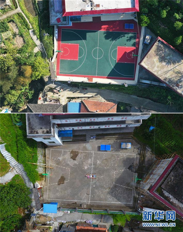 這張拼版照片的上圖為完成改造后的黨鳩小學(xué)塑膠球場(2020年4月15日攝,無人機照片);下圖為黨鳩小學(xué)改造前的球場(2019年7月5日攝,無人機照片)。新華社記者黃孝邦攝