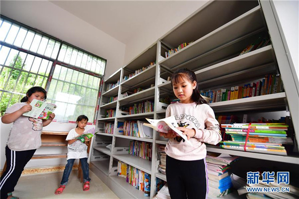 在廣西融水苗族自治縣桿洞鄉(xiāng)黨鳩小學(xué),學(xué)生們在圖書室里閱讀(5月13日攝)。新華社記者黃孝邦攝