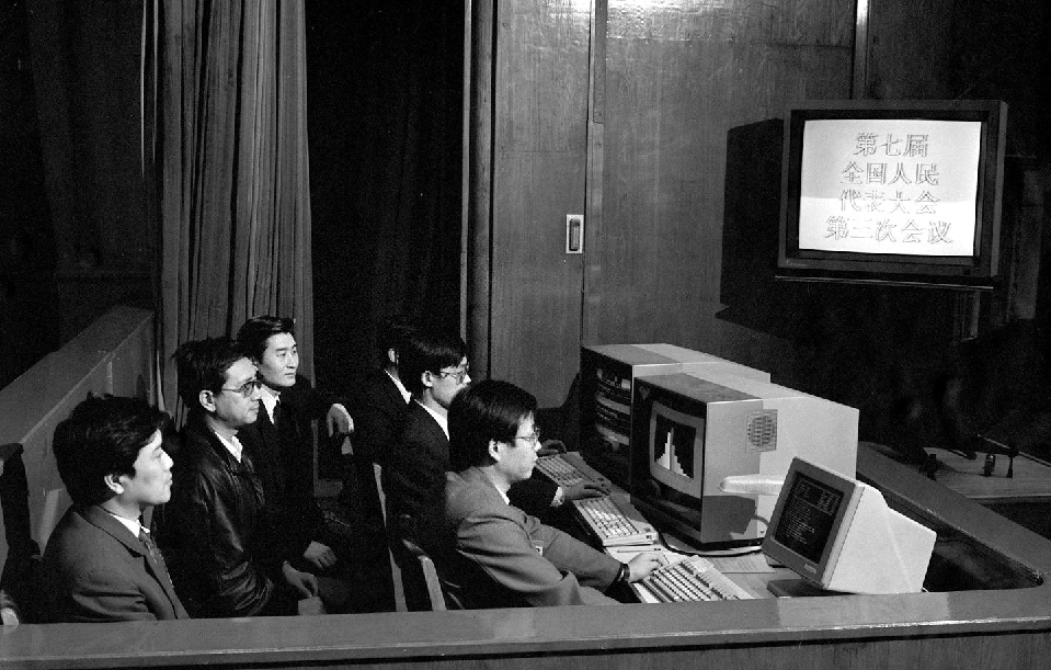 1990年3月,工作人員在七屆全國人大三次會議上監(jiān)視電子表決系統(tǒng)的運轉(zhuǎn)情況。這套電子表決系統(tǒng)有報到、表決和即席發(fā)言3種功能。這是首次啟用電子表決器。