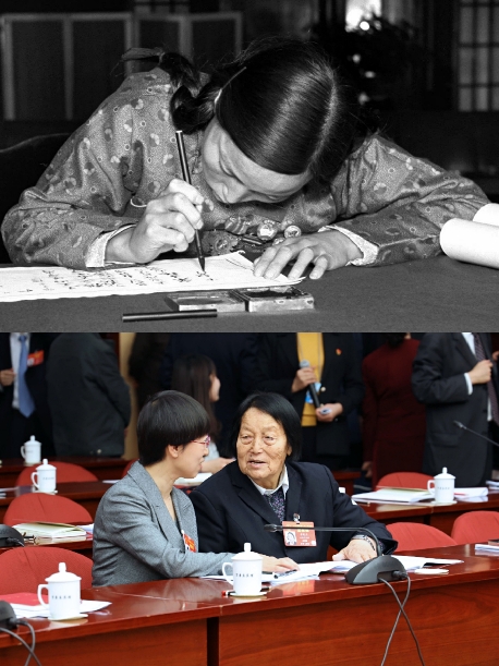 申紀(jì)蘭用她半生時間見證了中國民主法制建設(shè)的進程。上圖為出席第一屆全國人民代表大會第一次會議的人大代表申紀(jì)蘭在報到(1954年9月攝);下圖為她(右)在十三屆全國人大二次會議山西代表團會議間隙與青年代表交流(2019年3月攝)。