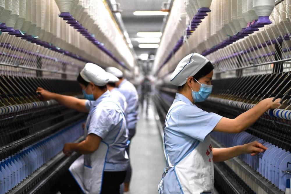 在抗擊新冠肺炎疫情過程中,陜西省咸陽紡織集團(tuán)有限公司一分廠紡織工人堅(jiān)守在復(fù)工復(fù)產(chǎn)一線,搶抓工時完成生產(chǎn)任務(wù)。(新華社記者張博文 攝)