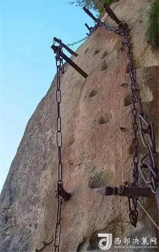華山還有一處常人不敢涉足的險(xiǎn)境--- 鷂子翻身。鷂子翻身在華山東峰是通往下棋亭的必由之路。其路鑿于懸崖上,下視唯見(jiàn)寒索垂于凌空,不見(jiàn)路徑。游人至此,需面壁挽索,以腳尖探尋石窩,交替而下,其中幾步需如鷹鷂一般、左右翻轉(zhuǎn)身體才可通過(guò)。此景只留英雄客,婦孺難聞幾聲咳。這句話(huà)現(xiàn)在也未然,巾幗不讓須眉,以后應(yīng)是往來(lái)無(wú)懼者,皆是英雄客了。