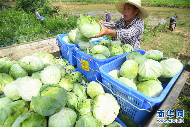 6月4日,在湘潭市雨湖區(qū)鶴嶺鎮(zhèn)龍安村,湘潭市仙女蔬菜產(chǎn)銷專業(yè)合作社的農(nóng)戶將采摘的包菜裝車。新華社記者 陳澤國 攝