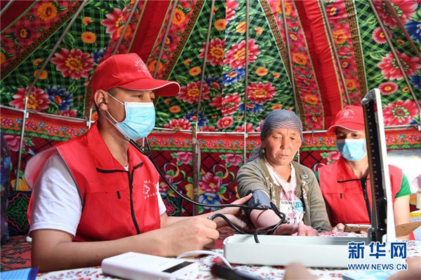 6月20日,新疆阿勒泰地區(qū)布爾津縣也格孜托別鄉(xiāng)克孜勒托蓋村村醫(yī)在布爾津縣黑流灘草原給牧民巴合提古麗·塔拉甫汗檢查身體。圍繞實現(xiàn)人人享有基本醫(yī)療衛(wèi)生服務目標,2016年起,新疆布爾津縣開展家庭醫(yī)生簽約服務工作。該縣組建家庭醫(yī)生簽約團隊65個,團隊醫(yī)務人員233名,通過手機APP、基本公衛(wèi)系統(tǒng)與全縣建檔立卡貧困戶進行電子化簽約,提升村醫(yī)隨訪的工作效率和質量。截至目前,已完成簽約42936人,履約40043人。新華社記者沙達提攝