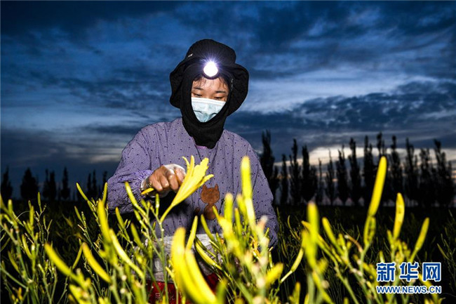 7月16日,在寧夏鹽池縣惠安堡鎮(zhèn)大壩村,農(nóng)民在日出前采摘黃花菜。新華社記者 馮開華 攝